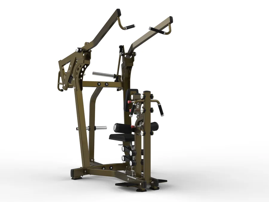 Jalón al frente con brazos de palanca y carga en placas. El dorsal ancho trabaja con la resistencia que ninguna columna de pesas puede alcanzar en usuarios avanzados.