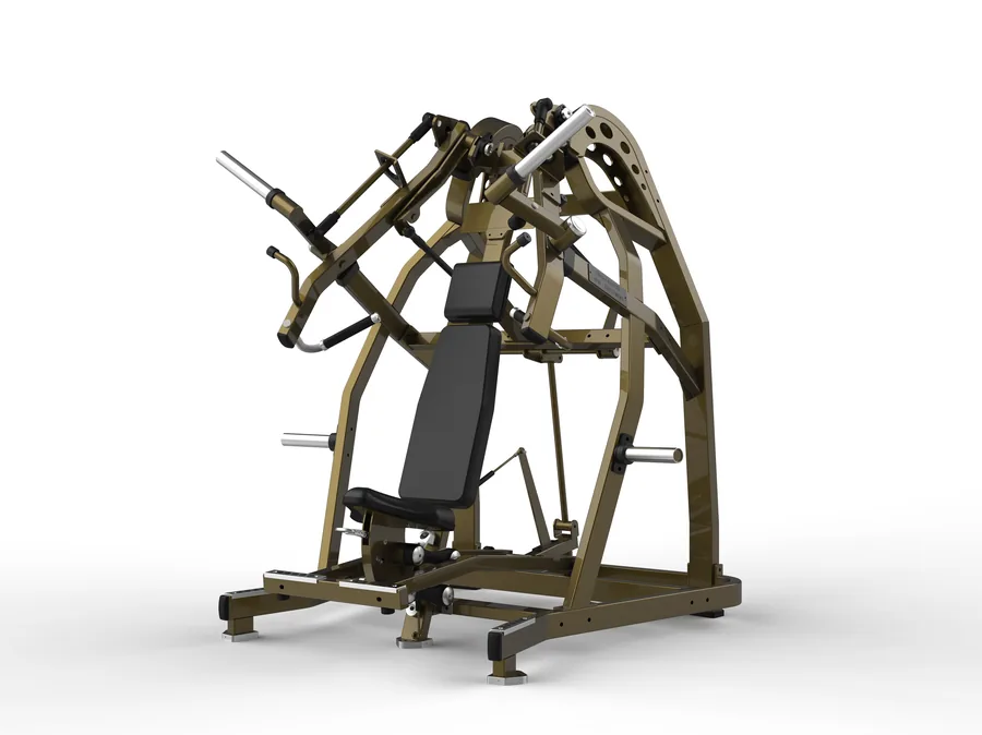 Press de pecho inclinado con carga en placas y respaldo ajustable. Pectoral superior y deltoides anterior con la carga que la selectorizada no puede igualar.