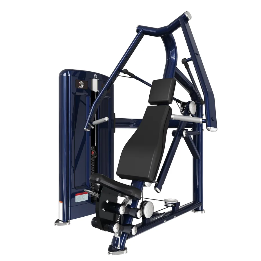 Press de pecho M7 con respaldo ligeramente inclinado y gatillo de ajuste de posición inicial. La trayectoria que imita el movimiento natural del hombro, no la que es más sencilla de fabricar.