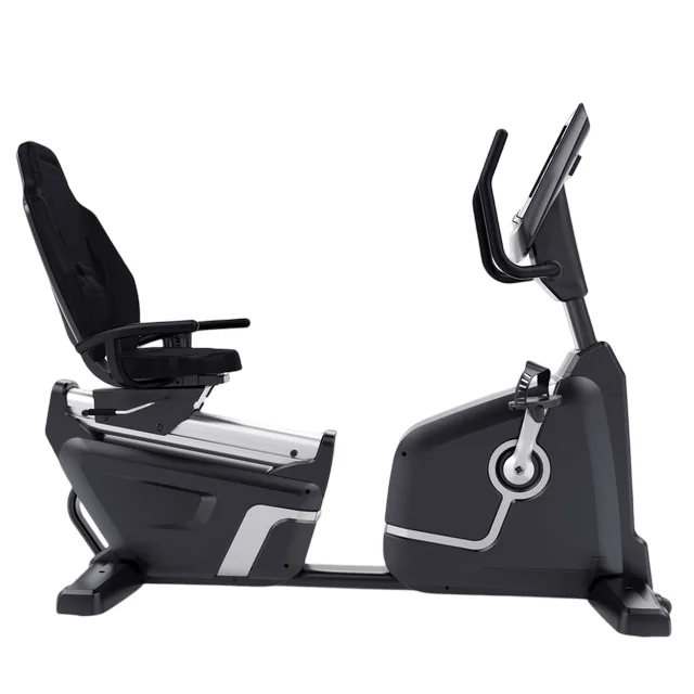 Bicicleta reclinada comercial con respaldo lumbar completo y pantalla de métricas. Cardio sin impacto articular — la opción para el usuario con rodillas, cadera o espalda comprometida que no puede dejar de entrenar.