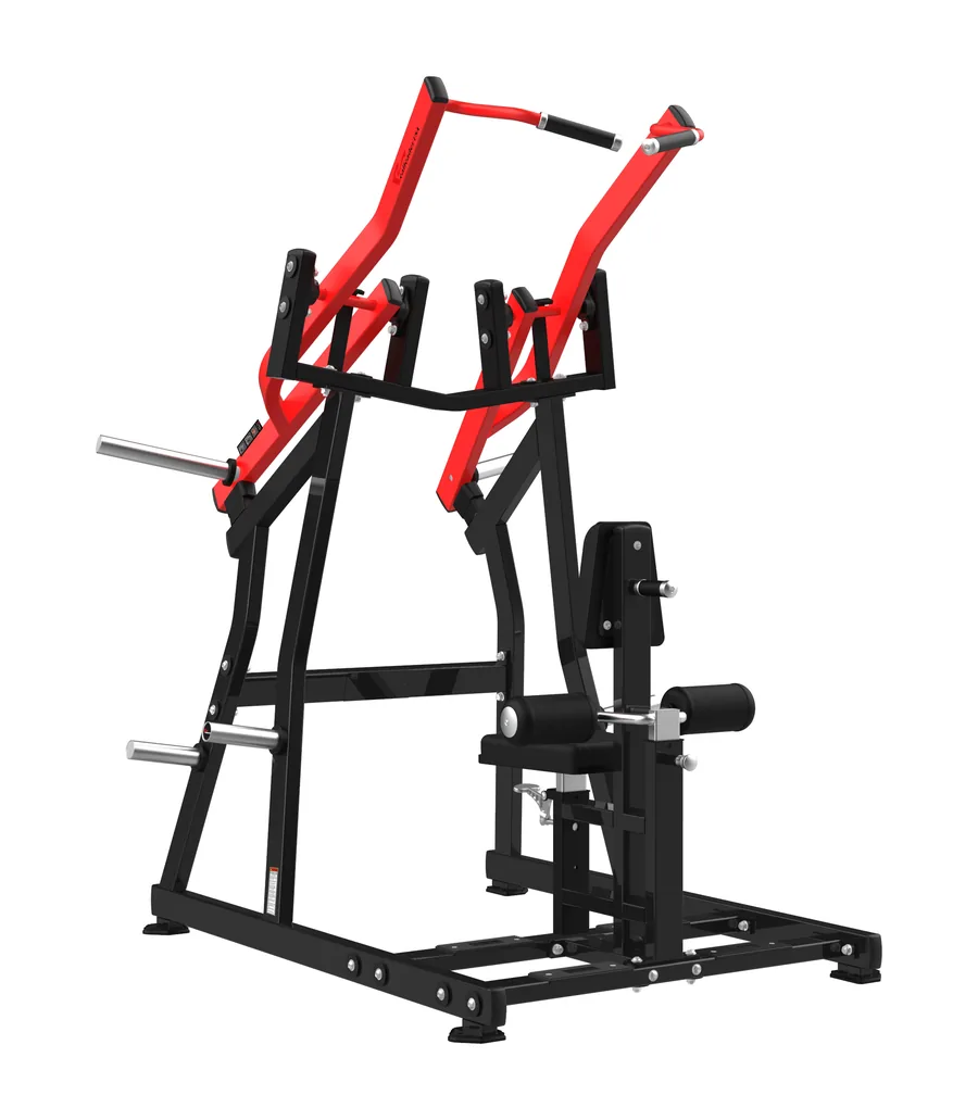 Jalón iso-lateral con brazos independientes y carga en placas. Dorsal ancho: cada lado trabaja por su cuenta, con la resistencia que ninguna columna de pesas puede igualar.
