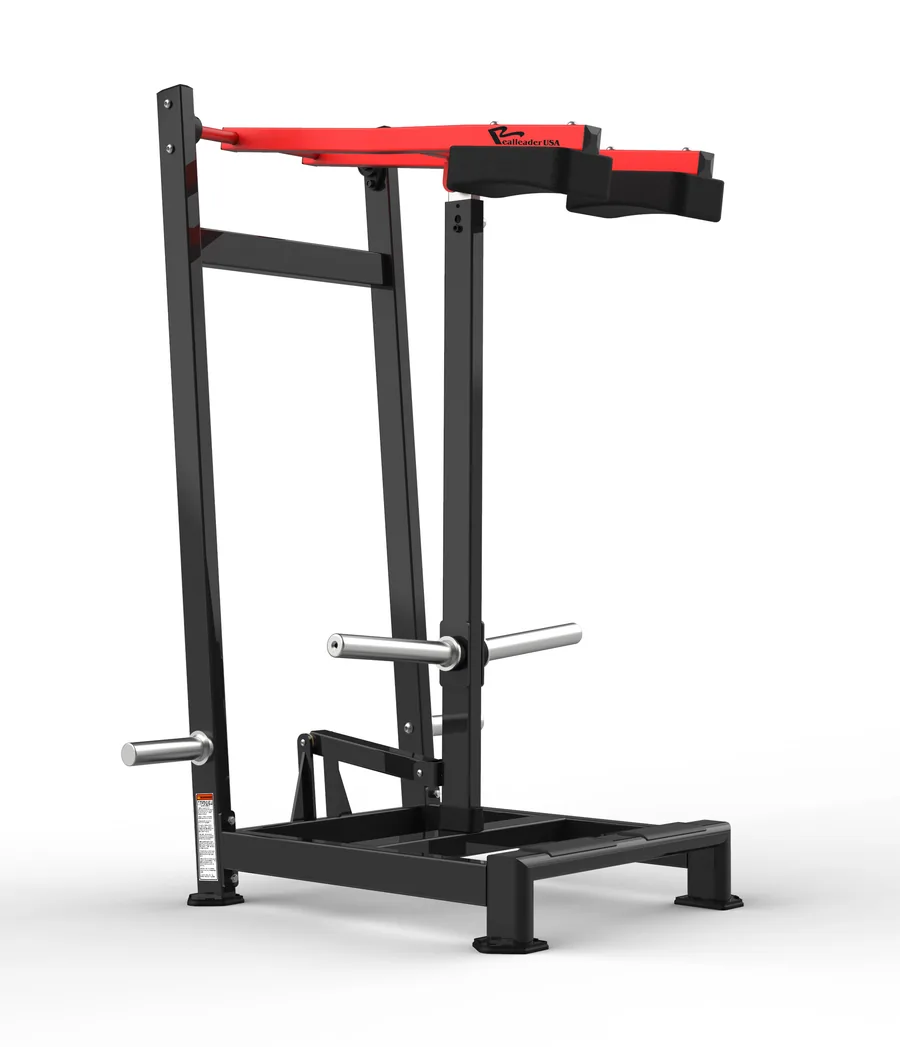 Elevaciones de pantorrilla de pie iso-lateral con soporte de hombros y plataforma. El gastrocnemio trabajado pierna por pierna — para el atleta que no puede permitirse diferencias entre lados.