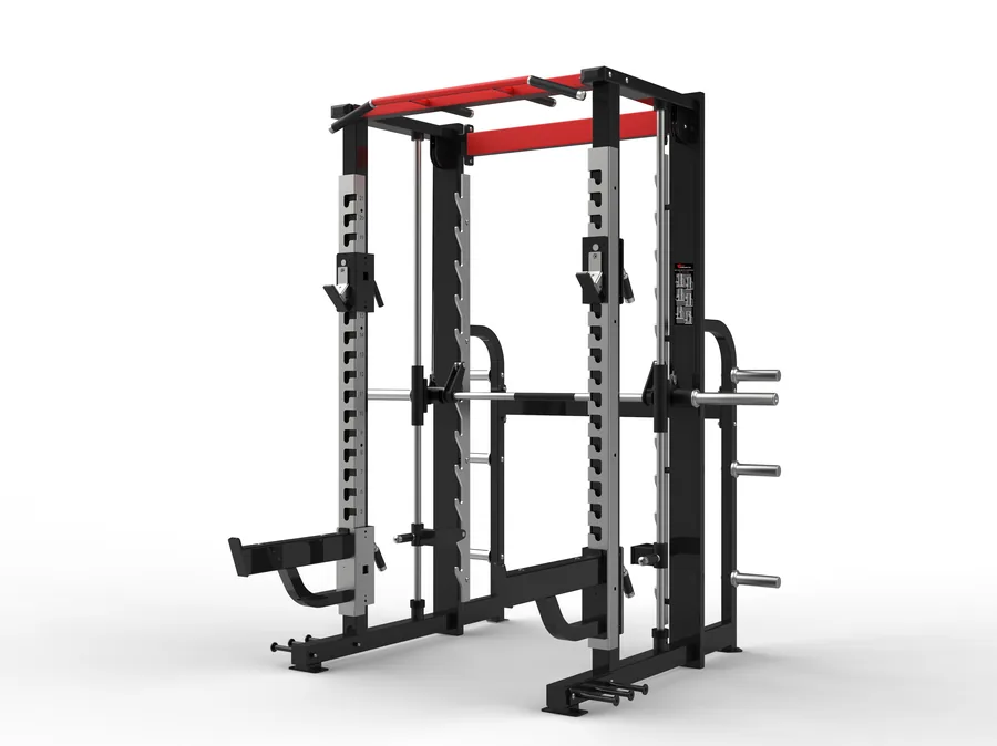 Smith machine con power rack integrado: barra guiada y bastidor libre en el mismo equipo. La estación de fuerza más completa del catálogo para el gimnasio que quiere todo en un solo bastidor.