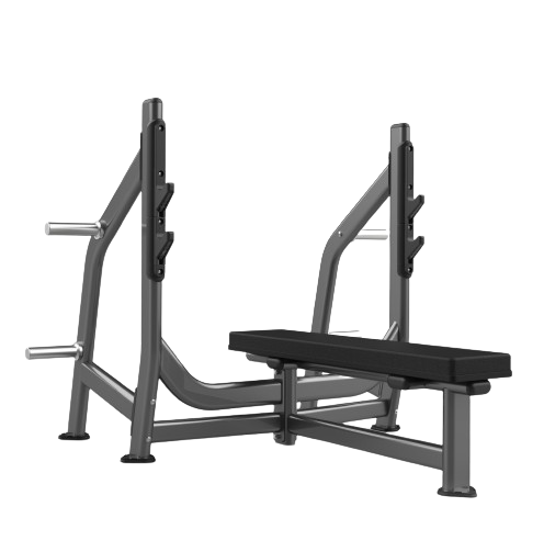 Pesas libres. Racks, mancuernas, barras olímpicas — la base de cualquier zona de fuerza libre.